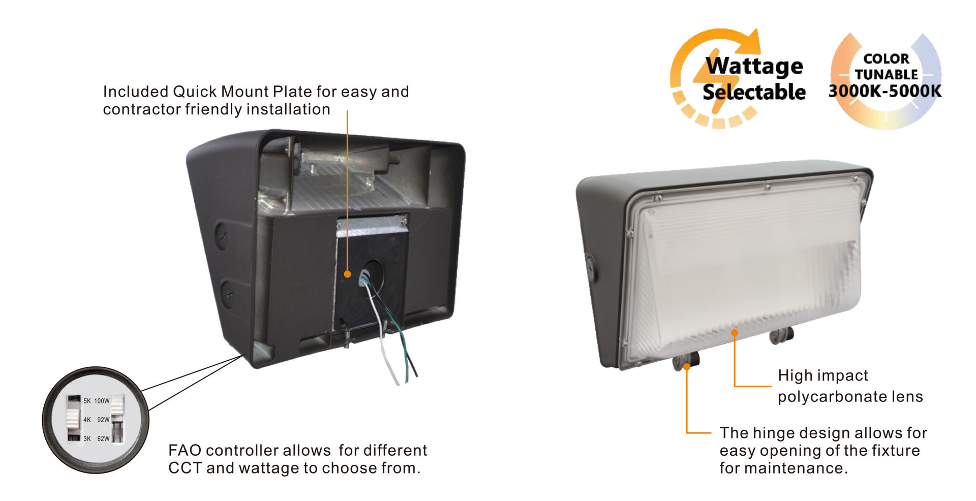 LED Wallpack - 30W/42W/46W Wattage Selectable - 6729 Max Lumens - Color Selectable 30K/40K/50K - 120-277V - Bronze Finish
