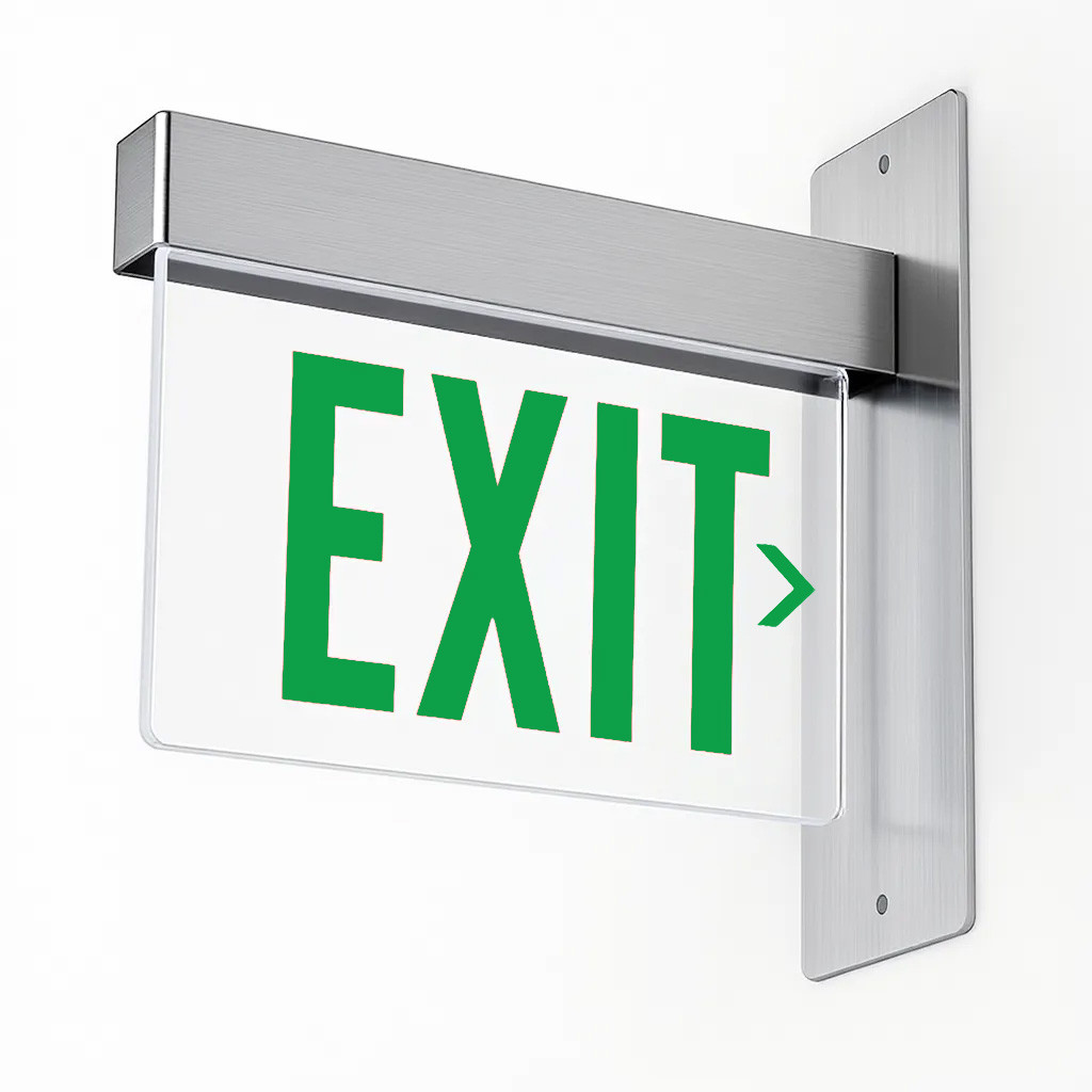 Lithonia Aluminum Edge-Lit Exit Sign, Single face, Green on clear, Right, Dual voltage, End mount, AC Only - NO Emergency Battery