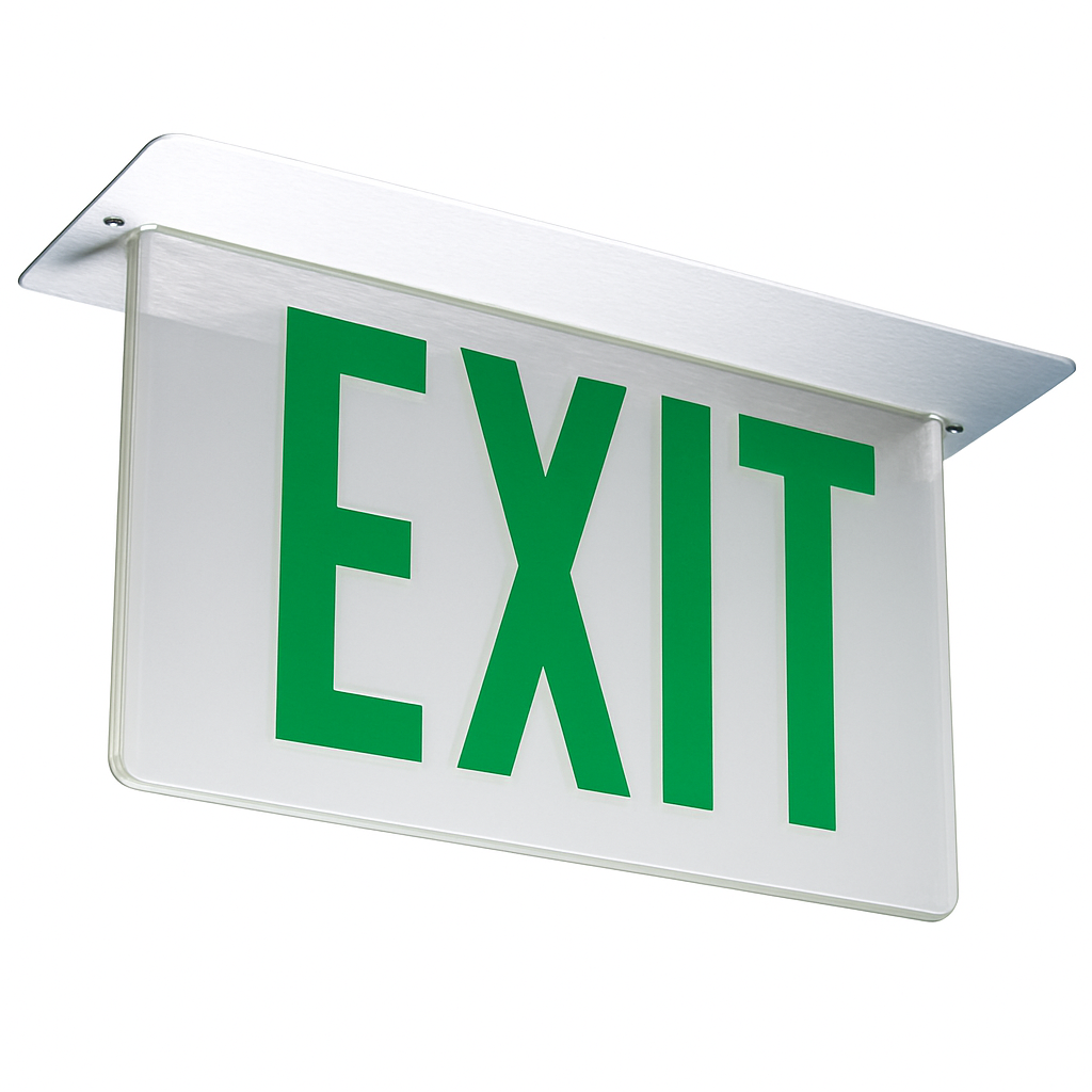 Lithonia Aluminum Edge-Lit Exit Sign, Single face, Green with mirror separator, Dual voltage, No Battery, Top mount to Jbox Only - Rough-In Housing Not Included