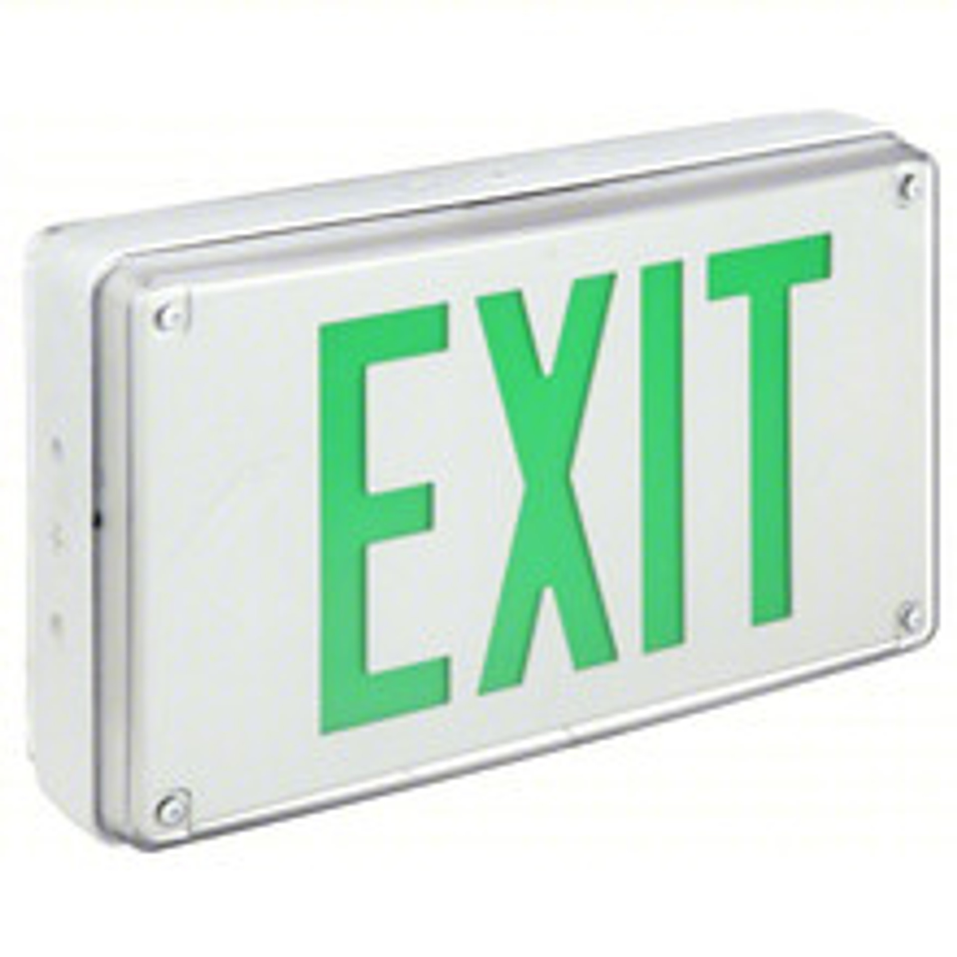 Vandal resistant, all conditions exits with LED lamps, Stencil Face, Single face, Green, Dual voltage, Emergency, Sealed, maintenance free nickel-cadmium battery