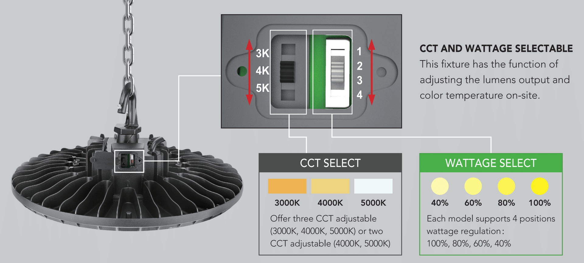 UFO LED High Bay Light - 150/120/90/60 Watt Selectable - 24000 Max Lumens - 110-277V - 5000K Daylight - 0-10V Dimmable - Black Finish