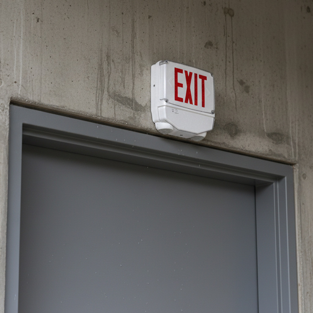 Wet Location Combo LED Exit Sign And Emergency Light Double Face- White Housing Color, and Red Lettering - With 90 Minute Battery Back-Up